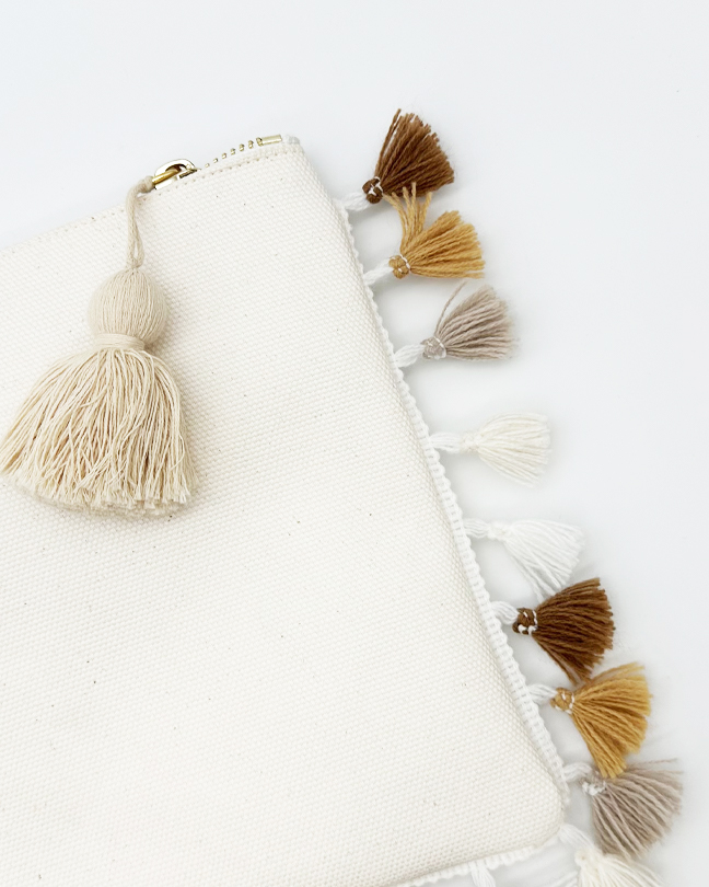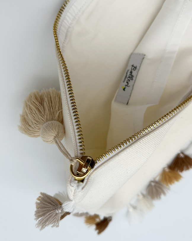 Clutch in canapa naturale, arricchita da eleganti nappine nei caldi toni della terra. Realizzata artigianalmente, unisce stile boho e sostenibilità. La pratica chiusura con zip la rende perfetta per custodire l’essenziale, sia di giorno che di sera. Un accessorio versatile che completa con gusto ogni look estivo.