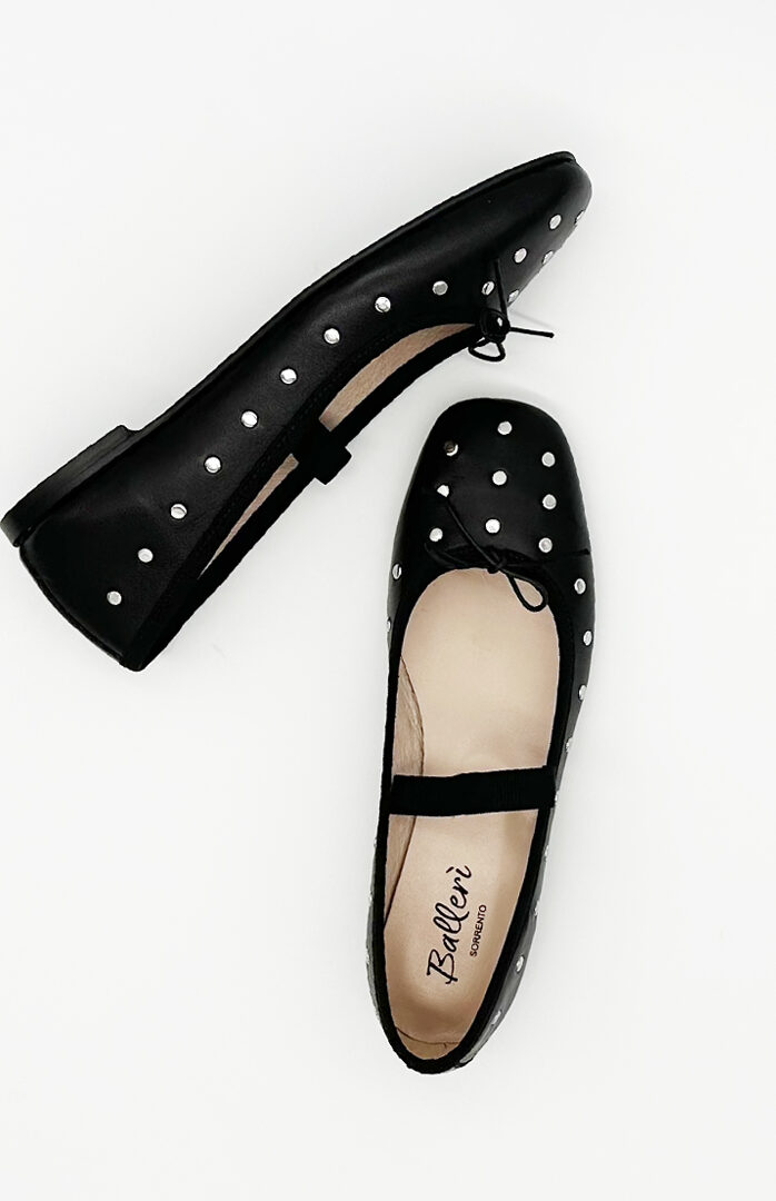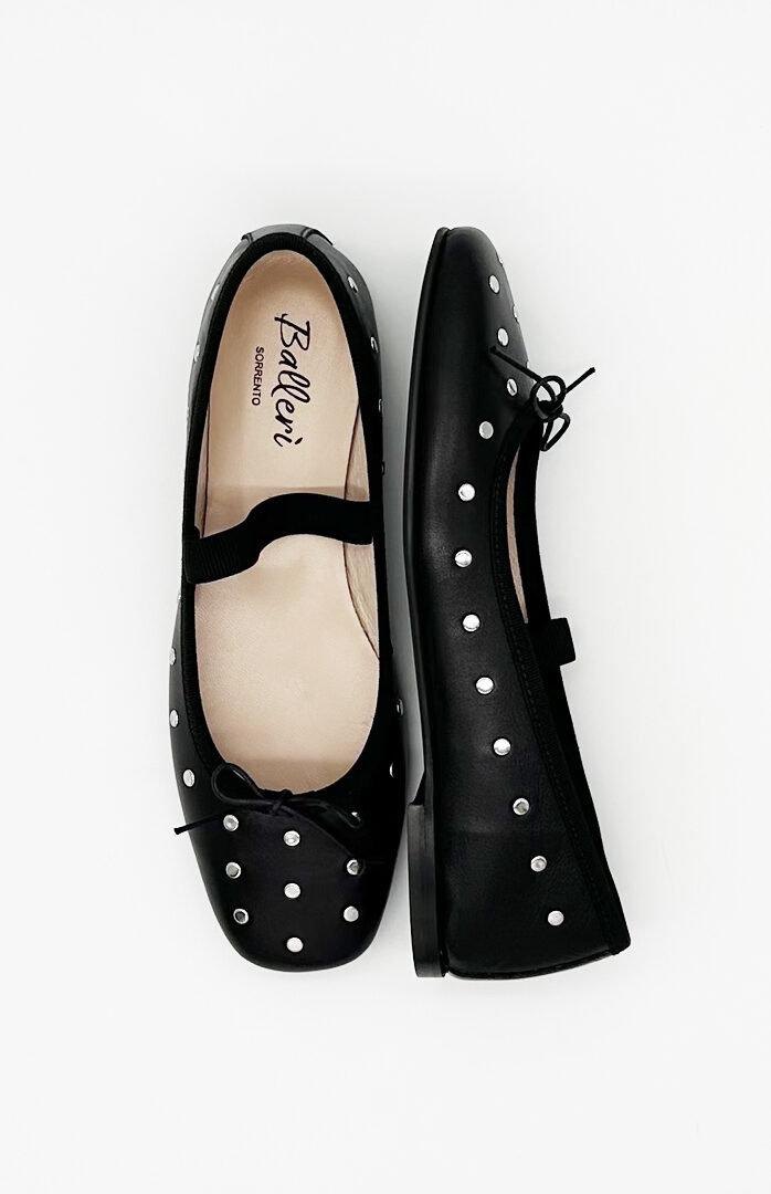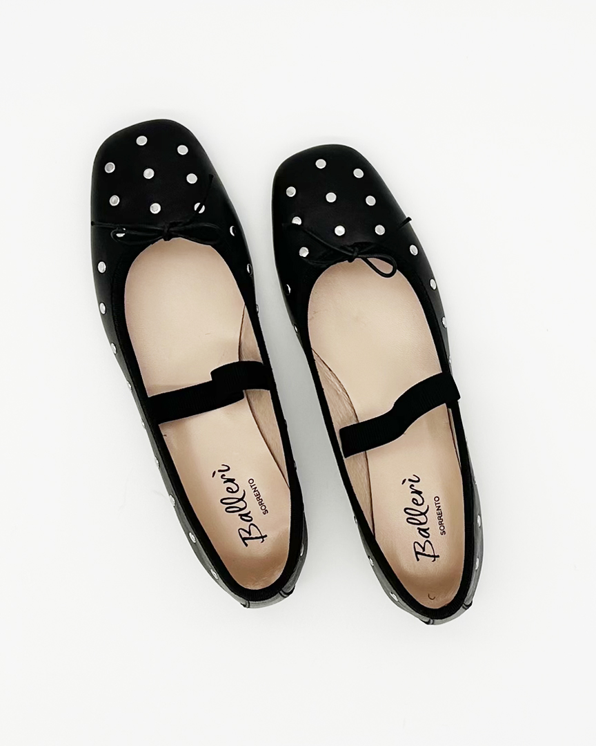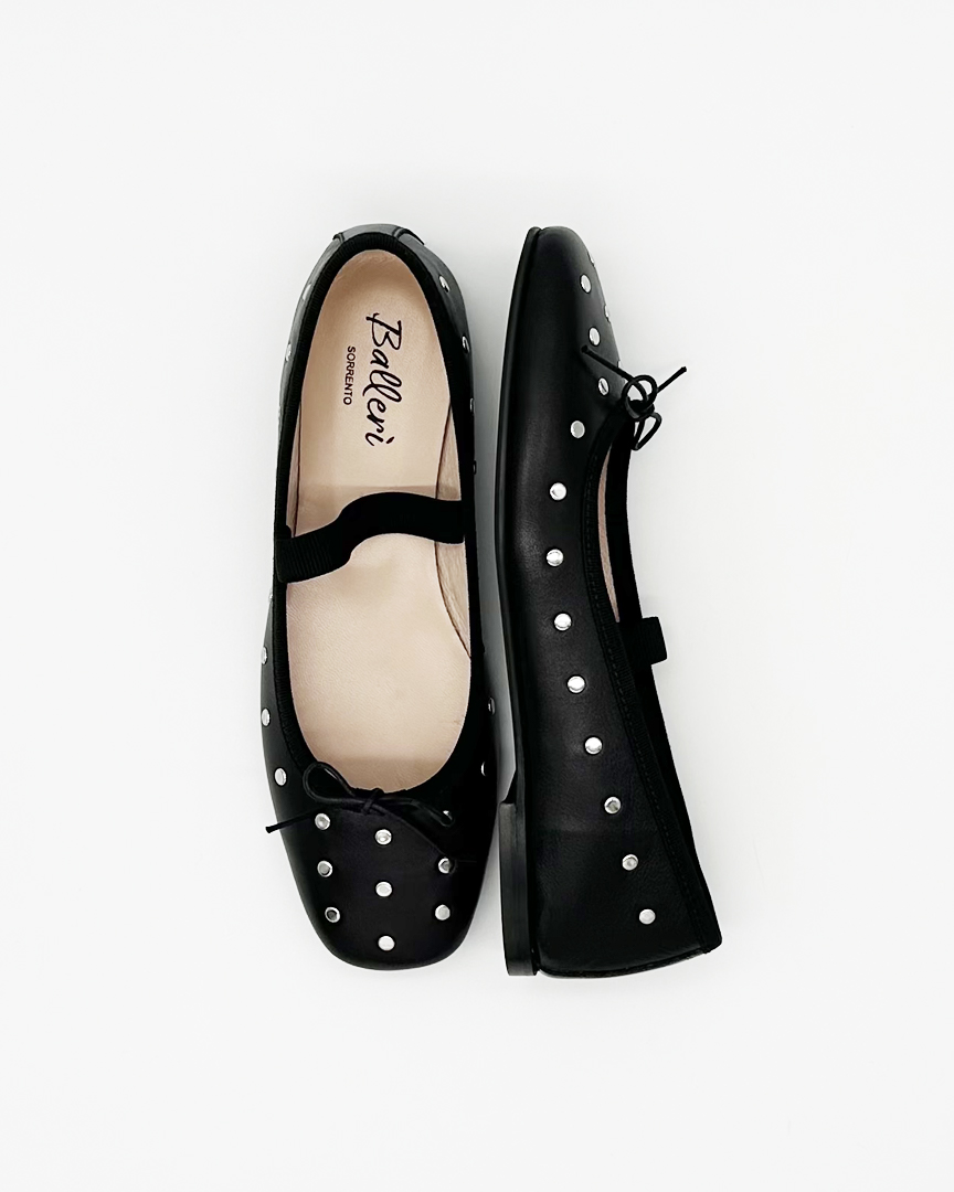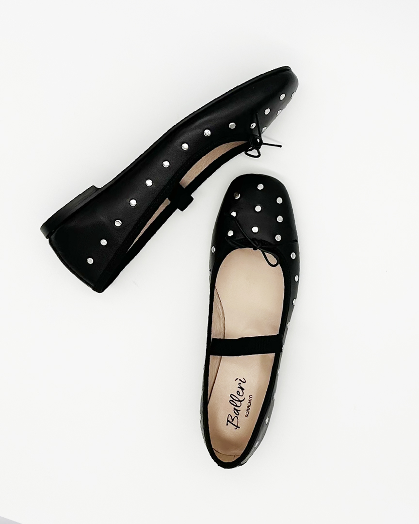 Comoda, versatile e dal carattere deciso: la ballerina Emma in morbida pelle nera, realizzata artigianalmente in Italia, è il perfetto equilibrio tra stile senza tempo e praticità quotidiana. Le borchie decorative donano un tocco contemporaneo, mentre la punta squadrata e il fiocco regolabile valorizzano elegantemente lo scollo del piede. Il cinturino elastico, indossabile anche sotto il piede per un effetto più pulito, garantisce una calzata stabile e confortevole, ideale dalla scrivania al dopo-lavoro. Perfetta con pantaloni sartoriali, denim o abiti in maglia, aggiunge un accento raffinato a ogni outfit.