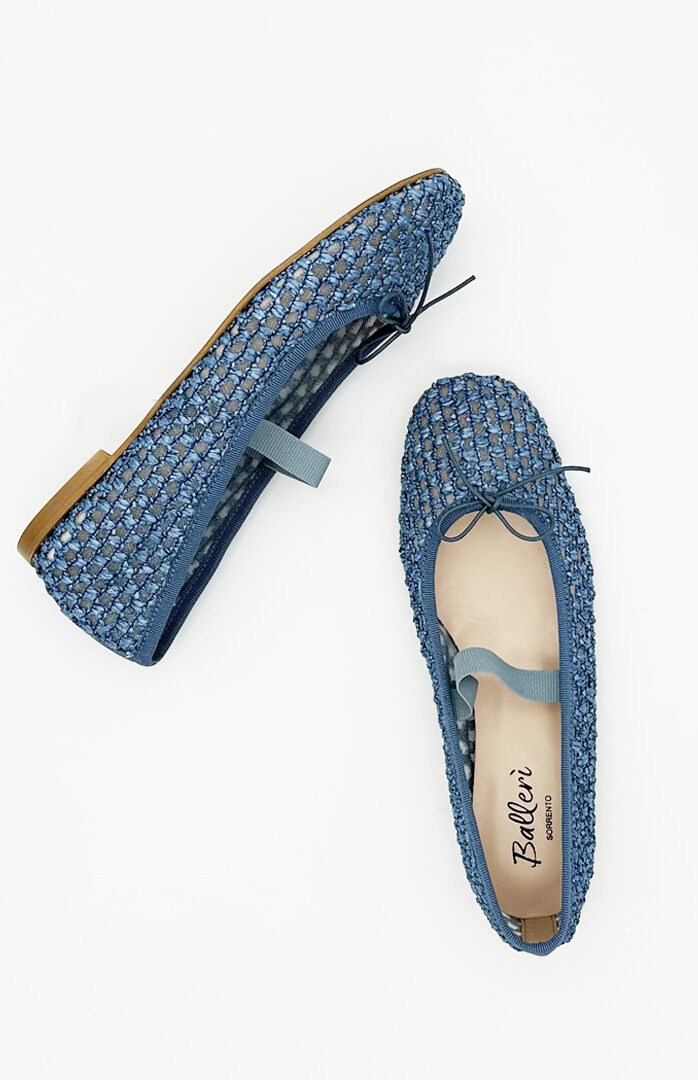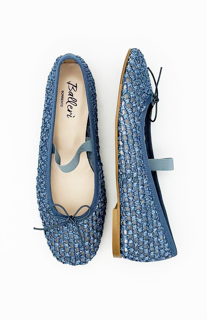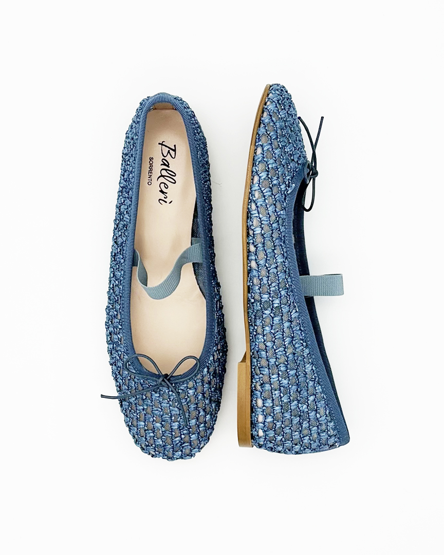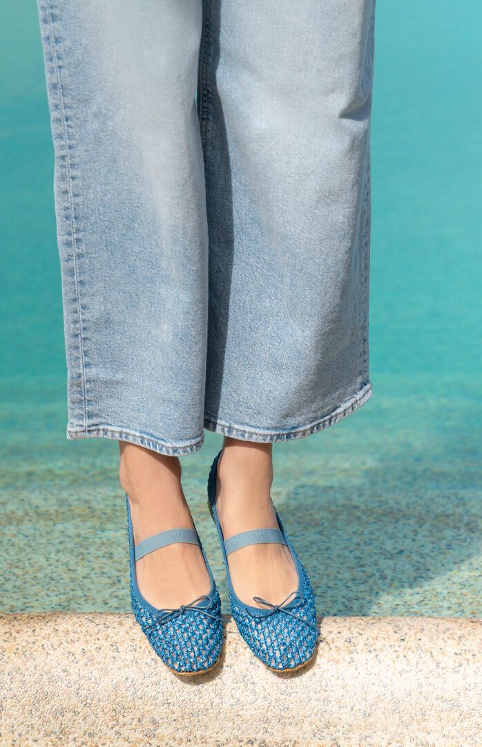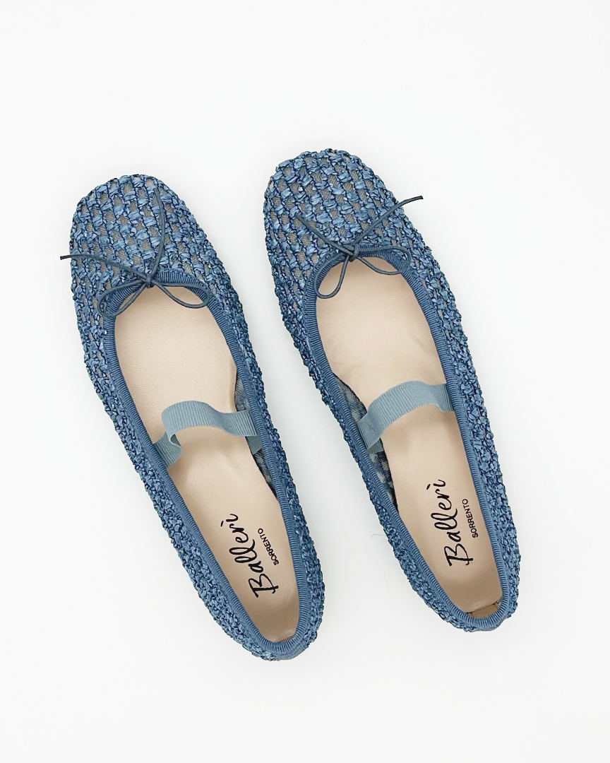 Ballerina in morbida rafia azzurra intrecciata all’uncinetto, leggera e traspirante, ideale per la stagione estiva. Il cinturino elastico assicura una calzata comoda e stabile, mentre il fiocco decorativo aggiunge un tocco femminile. La punta squadrata dona un look moderno e versatile, perfetto da abbinare a outfit casual o più eleganti. Una scarpa fresca e chic, perfetta sia in città che in vacanza.