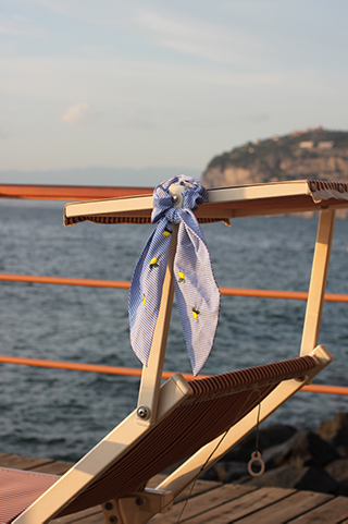 L'elastico per capelli Vietri ricorda gli 'scrunchies' alla moda degli anni '80 e '90. Realizzato a mano in cotone italiano e limoni ricamati. La fantasia a righe azzurre illuminerà tanti outfit estivi.