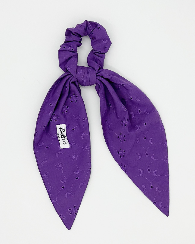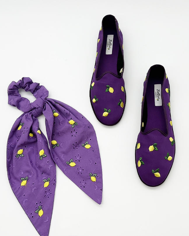 L'elastico per capelli Vietri unisce il fascino vintage degli scrunchies anni '80 e '90 a un tocco di eleganza artigianale. Realizzato a mano in pregiato sangallo viola, è impreziosito da delicati limoni ricamati che richiamano l’estate mediterranea. Un accessorio vivace e raffinato, perfetto per aggiungere colore e personalità a ogni look estivo.