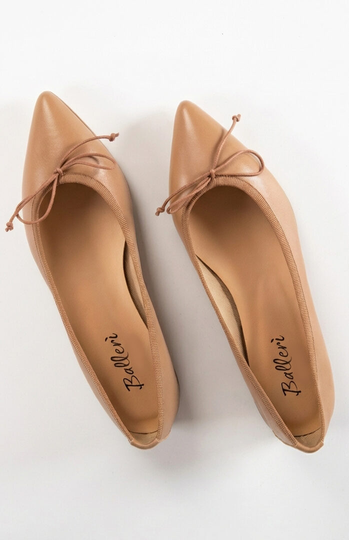 The Eleonora pointed ballet flats reinterpret a classic silhouette with a more feminine and refined shape. Made entirely in Italy from soft biscuit-colored leather, they offer lightweight comfort for all-day wear.