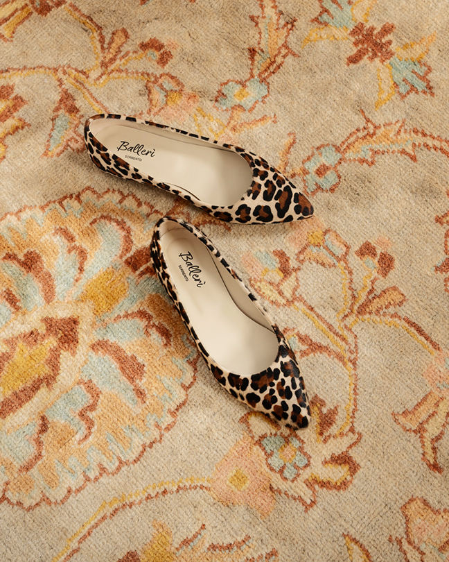 Delicate nel design e grintose con la tomaia in cavallino con stampa leopardata, le ballerine Olga aggiungeranno carattere alle vostre mise quotidiane. La punta è affusolata, mentre il tacco è fine e comodo, per accompagnarvi ovunque con disinvoltura ed eleganza.