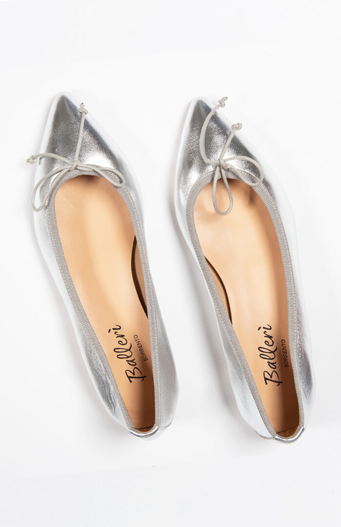 Le ballerine in pelle laminata color argento illuminano ogni outfit e donano un tocco sofisticato. Realizzate interamente in Italia dai nostri artigiani, queste ballerine sono eleganti e adatte a tutte le occasioni. Indossale con il jeans e un blazer blu o con maxi vestiti.