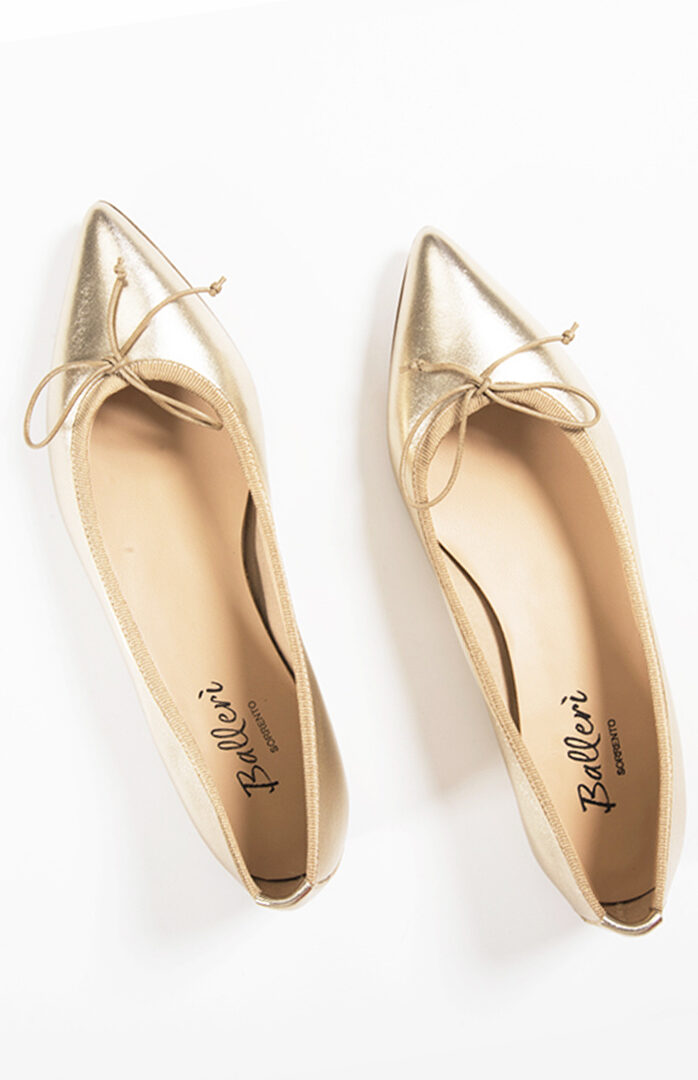 Le ballerine in pelle laminata color oro illuminano ogni outfit e donano un tocco sofisticato. Realizzate interamente in Italia dai nostri artigiani, queste ballerine sono eleganti e adatte a tutte le occasioni. Indossale con il jeans e un blazer blu o con maxi vestiti.