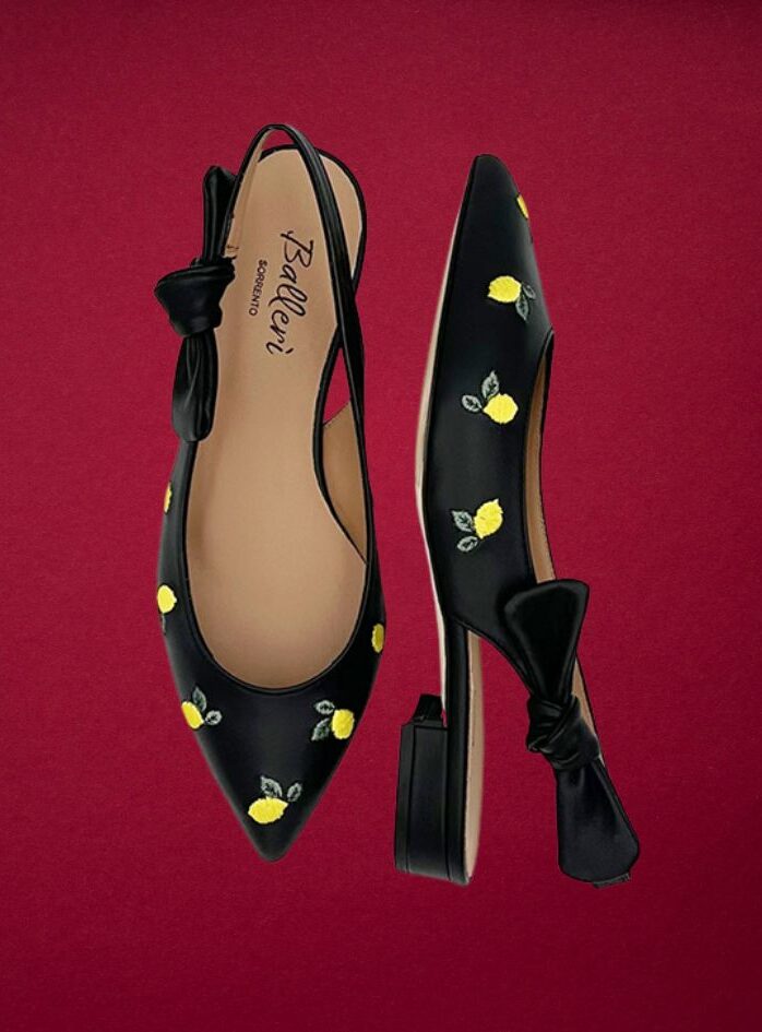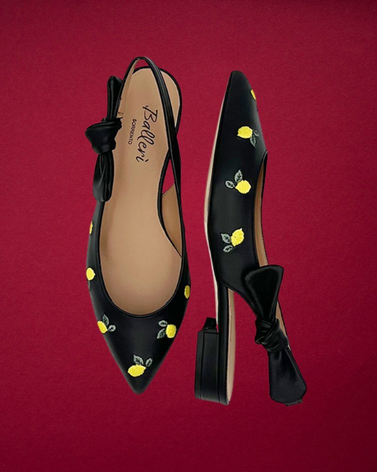 La nostra scarpa più iconica è un omaggio a Jaqueline Kennedy. Ricami di piccoli limoni in seta su morbida nappa, per ricordare le passeggiate di Jackie tra gli agrumeti dell'isola. Una scarpa dal design unico, un viaggio nei colori della Dolce Vita Caprese che coinvolge i sensi e la memoria.