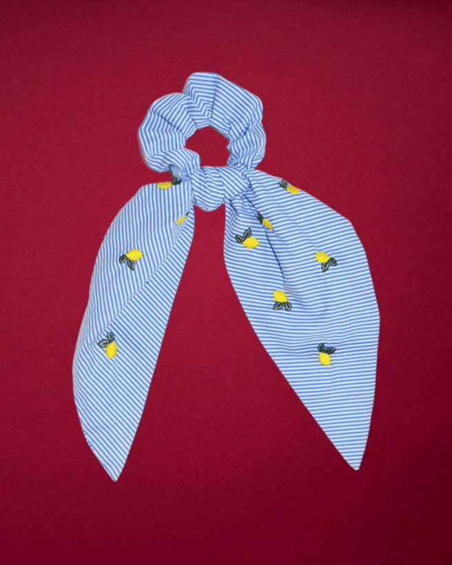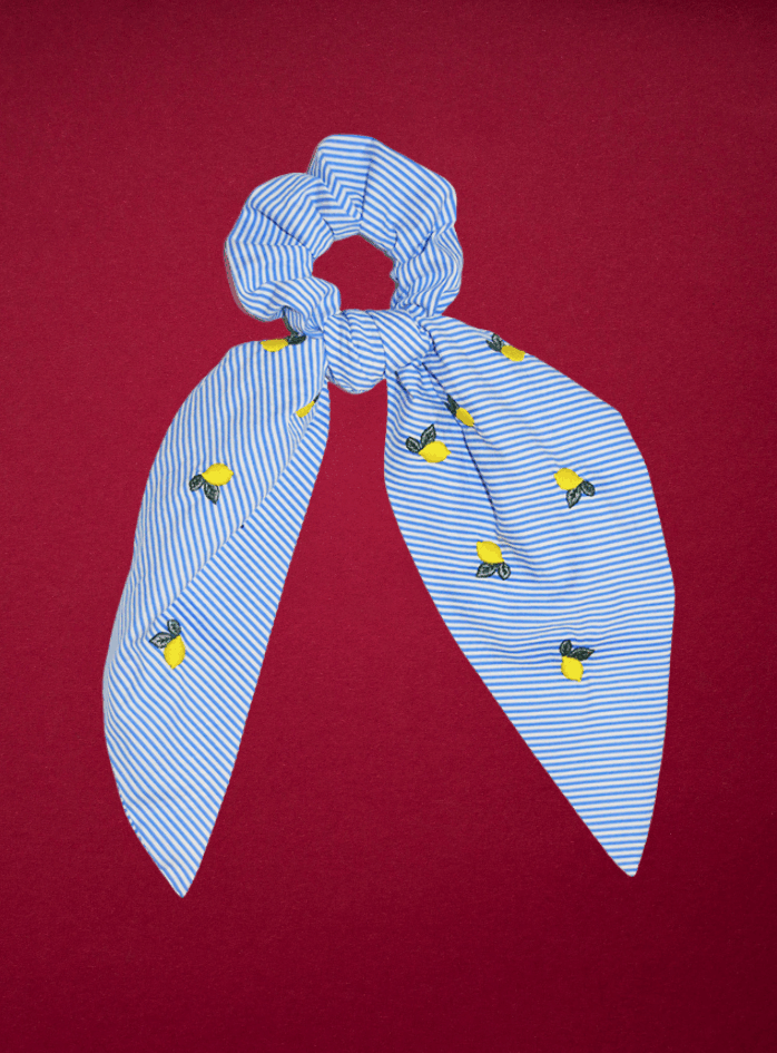 L'elastico per capelli Vietri ricorda gli 'scrunchies' alla moda degli anni '80 e '90. Realizzato a mano in cotone italiano e limoni ricamati. La fantasia a righe azzurre illuminerà tanti outfit estivi.